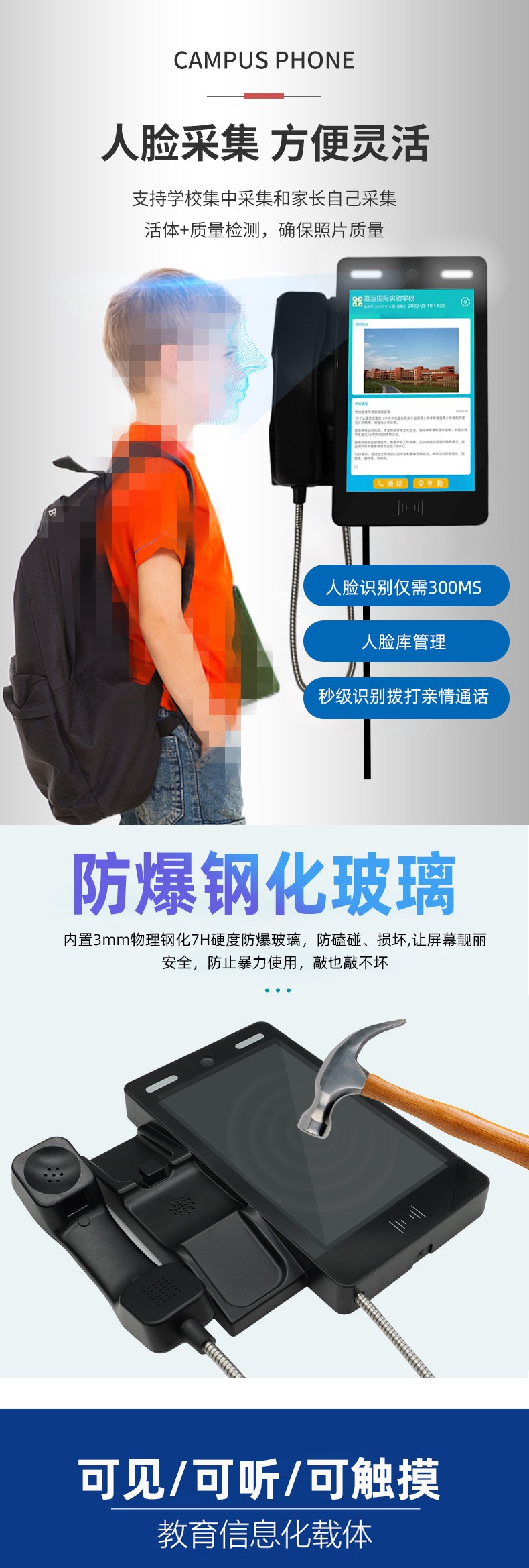 人臉識(shí)別可視話機(jī)產(chǎn)品穩(wěn)定,使用方便??梢酝ㄟ^(guò)人臉識(shí)別,撥打親子電話,學(xué)生可以選擇語(yǔ)音或視頻。